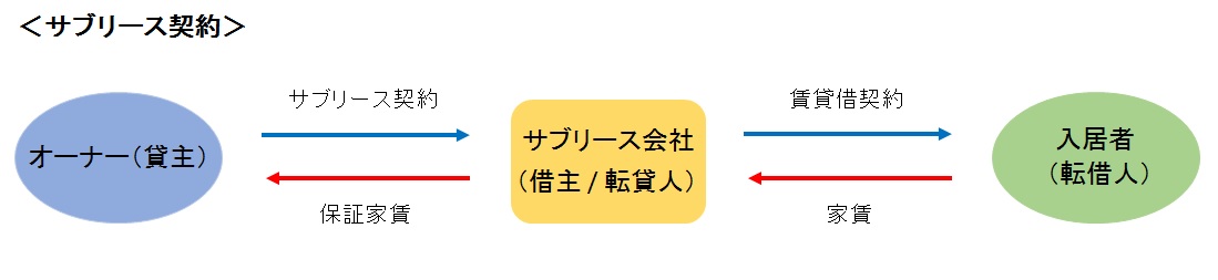 しかし、サブリース契約では、サブリース会社(不動産会社)がその賃貸物件を一括借り上げし、オーナーはそこから一定のサブリース料(保証賃料)を受け取ることができる流れとなります。
