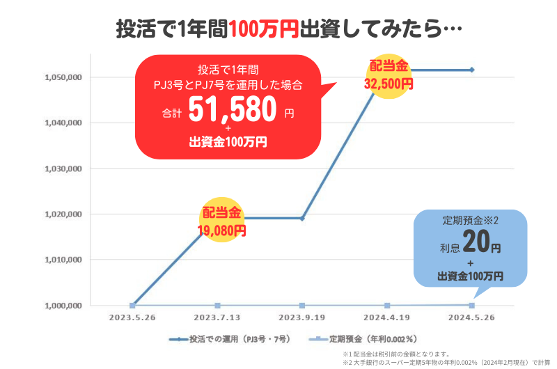 今回は、2024年1月までに運用を開始したプロジェクトを元に、一年間「投活」で運用した場合どれくらいの分配金がもらえるのか、一例をご紹介します。