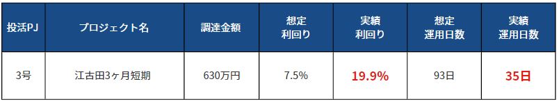 また、短期のプロジェクトが多く、1~2ヶ月に1度プロジェクトを組成するので、継続的に出資することができ投資家の出資機会の損失が防げるのも「投活」の魅力です。