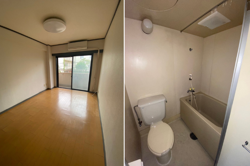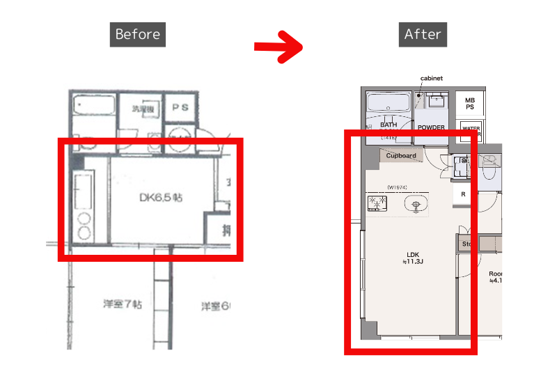 玄関に入ってすぐDKがあったコンパクトな間取りから、単身者に人気の1LDKに変更します。