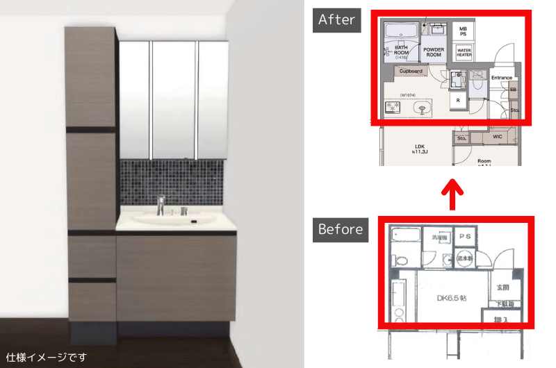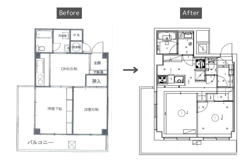 水回りの配管と梁(ハリ)のバランスに悩み、間取りを検討する段階で長時間頭を抱えました。パズルのように各設備を配置することができ、当初の面影がなく見違える物件になりました。