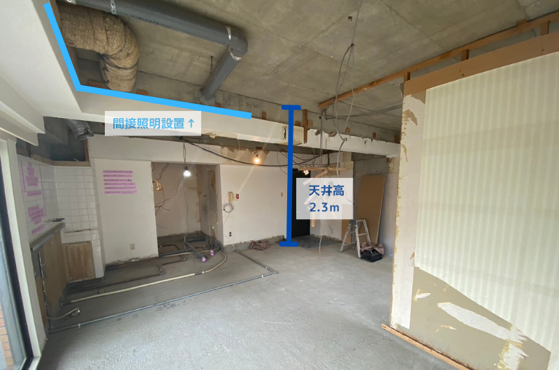 築年数が経っている中古マンションの場合、天井高2.2mほどの物件が多くありますが、今回の天井高は2.3mです。LDKはこの高さを確保して印象を良くするために、ダウンライトではなく間接照明を採用します。