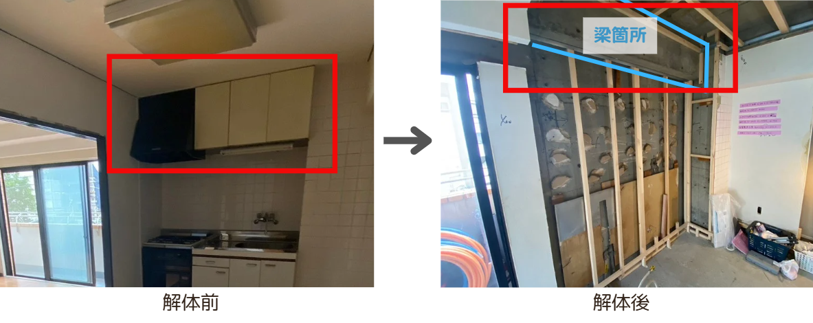 キッチン解体後に判明した梁(ハリ)により、レンジフードを壁付けできない事が判明しました。