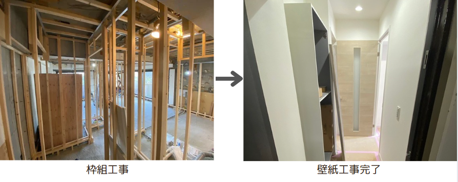 玄関から見た枠組工事から壁紙工事完了の様子です。