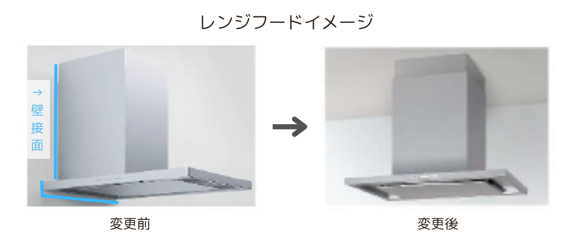 当初のレンジフードを加工することもギリギリまで検討しましたが、壁付けしないセンターフードに変更する事にしました。