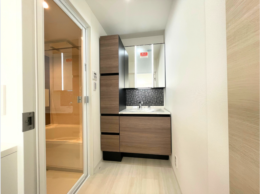 洗面台のバックパネルのモザイクタイルや、洗面鏡に縦に配置したフェイスフルライト、タッチレススイッチ、タッチレス水栓が機能性とお洒落度をアップさせています。