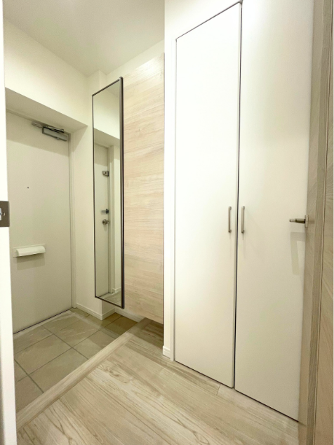 シューズボックスの扉一面は鏡になっているため、閉塞感が出てしまいがちな玄関スペースのアクセントになります。また、姿見鏡があることで機能性も向上します。