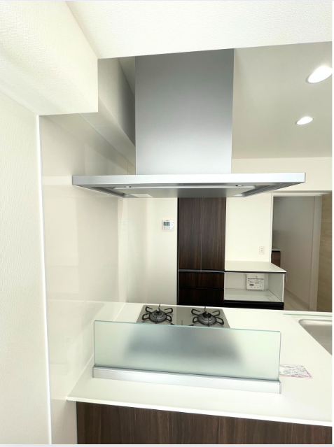 仕様変更したレンジフードは、ガスコンロを利用すると自動でレンジフードの電源が入る加熱機器連動機能が備わっています。梁(ハリ)に緩衝しない位置に収まり、当初のイメージのままのスタイリッシュなキッチンが実現しました。