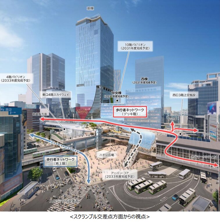 施工計画の見直しを重ねながら、2025年5月に「渋谷スクランブルスクエア第Ⅱ期(中央棟・西棟)」の工事が本格的に始動しました。2030年度をめどに、駅を中心とした多層歩行者ネットワークが概成予定で、翌年には「渋谷スクランブルスクエア第Ⅱ期」の竣工が見込まれています。