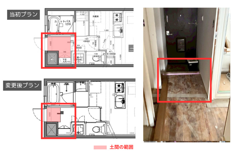 当初は広めの土間を想定していましたが、配管設置の関係で床を下げることができないことが分かりました。