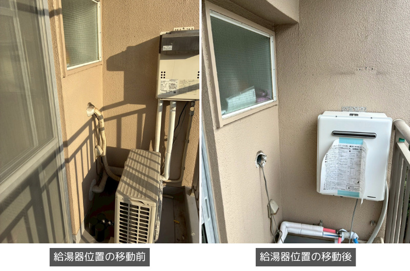 また、FIX窓の下に設置されていたエアコンの室外機についても、エアコン本体の配置変更にあわせて反対側へ移設することで、給湯器と干渉しないレイアウトとしました。